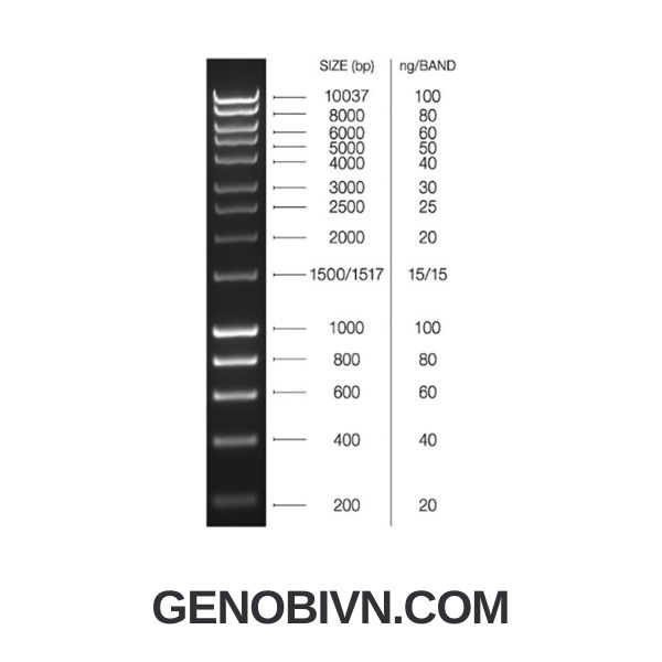 Có 14 dải DNA được phân bố đều, trải dài từ 200 bp đến 10.037 bp. Các băng chuẩn tại 1000 bp và 10.037 bp được làm nổi bật với cường độ sáng mạnh hơn, cùng với một băng đôi ở 1500/1517 bp, giúp người dùng dễ dàng quan sát, nhận diện và xác định vị trí DNA chỉ với một lần nhìn nhanh.